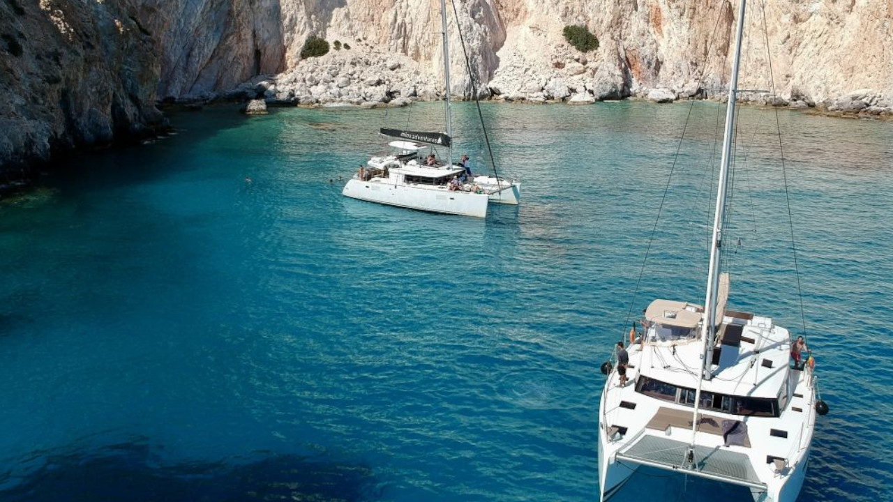 Step aboard your private luxury catamaran from Agia Kyriaki at 15:00, where the crew will welcome you via tender boat. Settle in and relax as you cruise toward the legendary Kleftiko, the former hideout of pirates and one of Milos' most iconic locations. There, you'll have time to swim in crystal-clear turquoise waters, snorkel through impressive sea caves and admire the striking white rock formations rising from the sea.