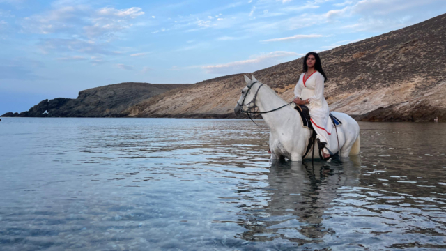 Embark on a mesmerizing journey amidst the rugged volcanic landscapes of Mykonos, where the finest horses roam freely in their natural element.