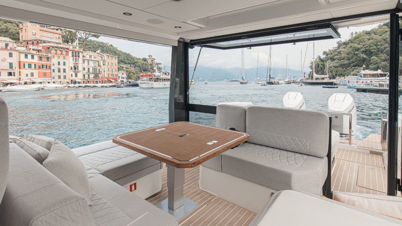 Twin high-performance outboard engines provide smooth acceleration and responsive handling, while the cleverly designed fold-out side terraces expand the deck, creating a panoramic lounge at water level. Sunbathing, swimming, or enjoying a drink with ocean views has never been easier.